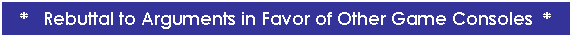 ► [Why not buy the visual greatest and the fastest consoles like Play Station 3 or Xbox 360?] We play game for physical exercise, relax, and healthy entertainment. Visual greatest and fastest are good to have but not on top of our priority list. Play Station 3 and Xbox 360 just do not have game title like Fit - the healthy living game supported by Nintendo Wii. We oppose game addition. We shall prevent over stressed on fingers and eyes by playing games. Wii has the least of these drawbacks of video games.